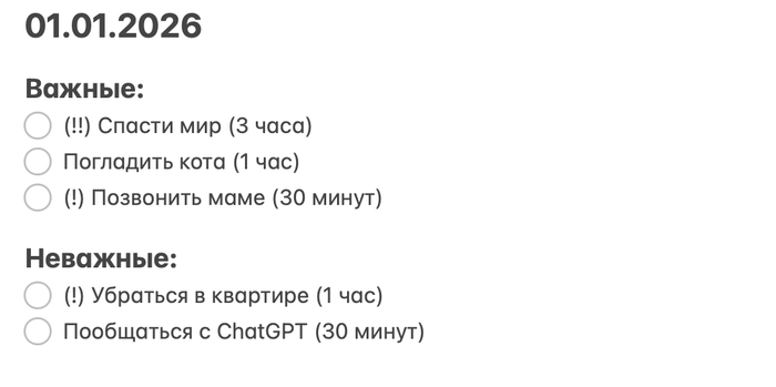Теперь поговорим о срочности задач. Есть задачи с дедлайном, а есть без. Если дедлайн задачи ограничен следующим днём — поставьте два восклицательных знака (!!). Если дедлайн ограничен, но не следующим днём, а плюс-минус неделей, то поставьте один восклицательный знак (!). Если дедлайн не ограничен, то не ставьте ничего.