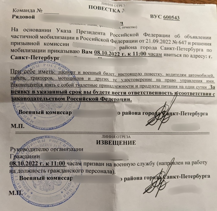 7 октября мама присылает фотку повестки, которую сунули в дверь, предварительно (вот же гады) оторвав часть в которой я должен расписаться. Видимо хотели на дурачка прокатить.