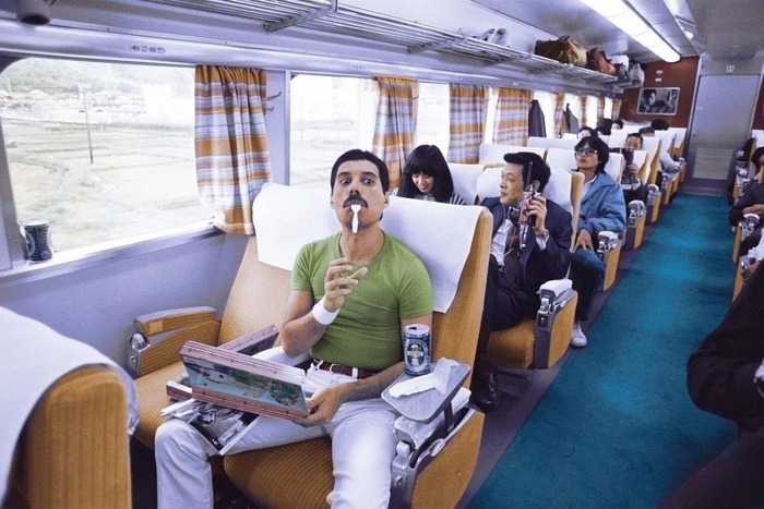 Фредди Меркьюри ложкой во рту в японском поезде, 1982 год.