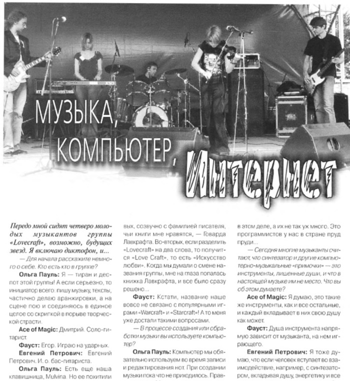 Со своей группой я завязал, так как на неё у меня просто не оставалось свободного времени, ибо с новой группой мы репетировали 3-4 раза в неделю. Да и, честно сказать, сравнивая свой панковско-говнороковый материал с теми песнями, что делала Оля и компания, я понимал, что сделал правильный выбор. После нескольких недель репетиций мы решили устроить концерт в нашей музыкальной школе, как раз в том самом актовом зале, рядом с которым мы играли. Для этого нам нужно было как-то назвать группу, так как «Velvet» уже никого не устраивал. Так вышло, что как минимум трое из нас в то время увлекались творчеством Говарда Лавкрафта и на коллективном собрании было принято решение назвать нашу группу «LoveCraft». К сожалению, всего за месяц до нашего первого концерта, Вита покинула группу и нам нужно было невероятно срочно найти бассиста. И вот на пороге нашей каморки появился двухметровый здоровяк по имени Евгений. Он послушал наше творчество и оно его так зацепило, что он немедля согласился стать частью нашего маленького, но очень гордого коллектива, а на вопрос «ты же знаешь ноты?» он ответил «конечно», что окончательно убедило нас в его профессионализме. Только спустя несколько месяцев Женя как-то поведал мне, что ответил «конечно», потому что он знал названия нот, но в жизни по ним не играл и нотной грамоте обучен не был. Тем ещё более крут тот факт, что Жека всего за неделю научился читать ноты и выучил все наши песни. В результате наш первый концерт прошёл «на ура», хотя, конечно, не без косяков, но это нас нисколько не смутило и мы, уверенные в своих силах, ринулись покорять рок-клубы Санкт-Петербурга.