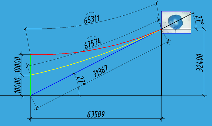 А вот так могла лететь ракета - поднимись стрелок выше траектория становится короче. Синяя линия - пуск с земли. Жёлтая и красная линия - с высоты 10 и 20м.Такие высоты могут быть только если использовать деревья.Вероятнее всего второй стрелок использовал высоту 10м - обычная высота лесного дерева. Но это пока примерное предположение. Второй стрелок использовал для маскировки деревья, то есть возвышенность. Второй стрелок был дальше и выше по расположению чем Пятачок. Высота 32,4м - это высота полёта Винни и шарика из предыдущего поста. Зная угол попадания в шарик можно найти наибольшее расстояние по горизонтали от него. Дистанция до точки запуска с земли - L=32.4м /tg (90гр-27гр)=63,6м Для демонстрации траектории показаны с одинаковой дистанции в 63,6м. Это рисунок показывает что угол прилёта в 27 градусов можно получить при достаточно прямом движении ракеты с небольшими вариациями в виде дуг больших радиусов. Насколько же далеко и высоко он находился второй стрелок выясним позже.