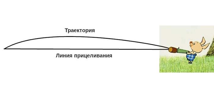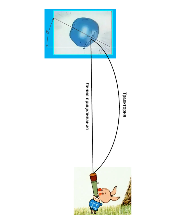 Если продолжить траекторию снаряда, можно увидеть, что выходное отверстие в шаре не совпадает с указанной схемой. НО... У Пятачка не просто ружье. Его оружие является мортирой, то есть стреляет по более навесной траектории.
