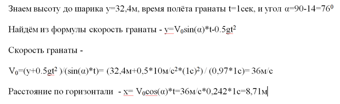 Если посмотреть хронометраж мультфильма - то время полёта гранаты Пятачка к Винни ну округлённо 1 секунда, знаем угол стрельбы Пятачка - 76 градусов. Знаем высоту на которой завис шарик - 32,4м. Можно узнать скорость гранаты и расстояние по земле насколько он был далеко от Винни по горизонтальной его проекции на землю.