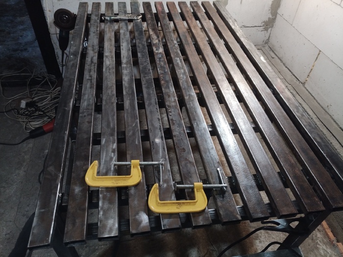Далее делаем столешницу, профильную трубу 50х25 длиной 1,5 м привариваю к раме, интервал между трубами 30 мм.. Как раз что бы струбцина поместилась.
