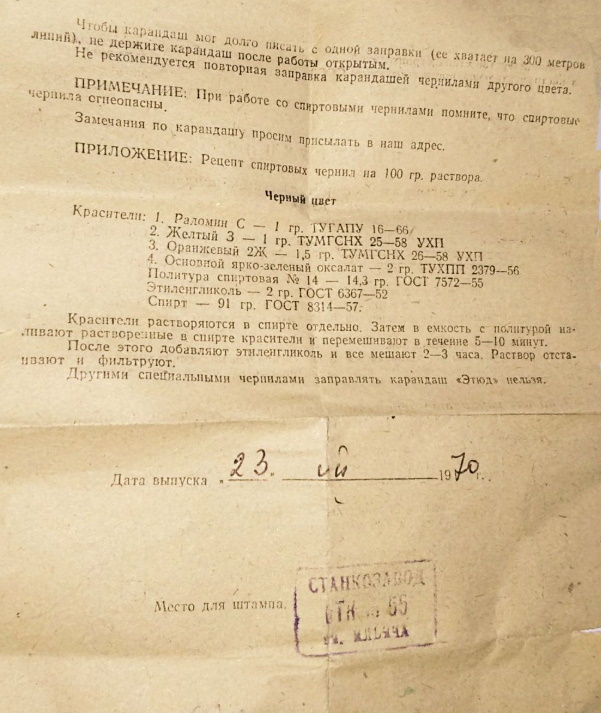 Интересно и то, что самые первые советские фломастеры поступали в магазины уже заполненные цветными чернилами. Чуть позже их стали выпускать пустыми, а чернила продавались отдельно. Что характерно, заполнять «Этюд» можно было и обычными чернилами «Радуга» — для авторучек, только не рекомендовалось смешивать разные сорта: либо те чернила, что для ручек, либо специализированные, для фломастеров.