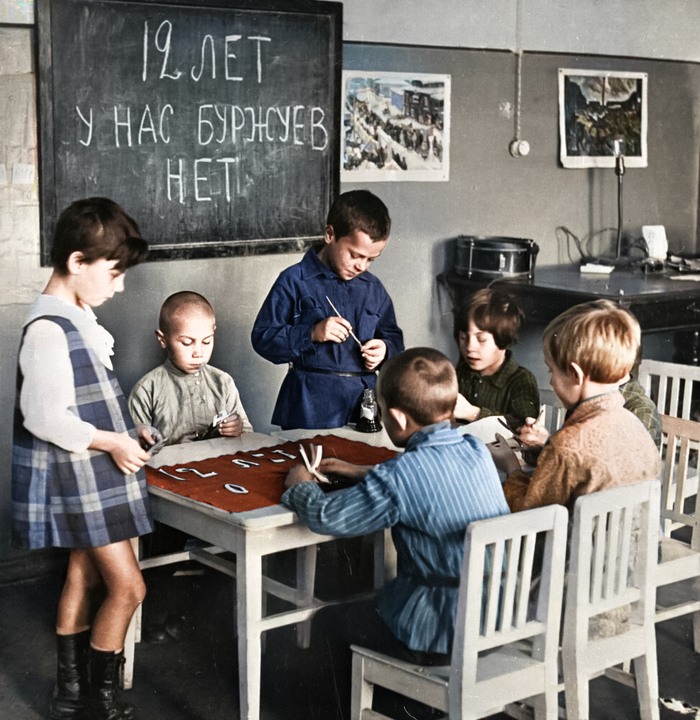 Воспитанники детского сада изготавливают плакат к празднованию 12-й годовщины Октября. СССР, 1929 год.