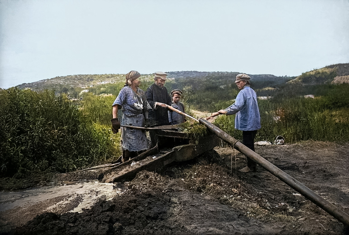 Промывка золота старателями из отвалов. Уральская обл., Троицкий округ, Юльевский прииск, 1926 год.