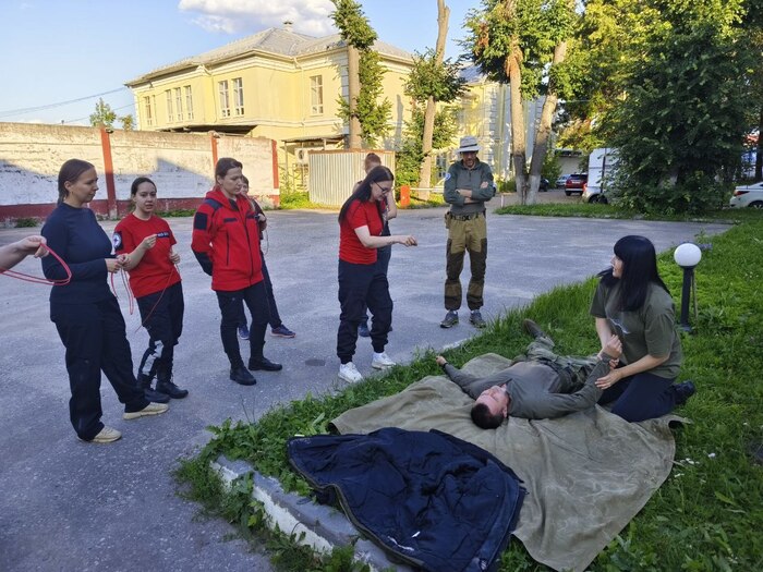 -Практическая часть по изучению приемов первой помощи и эвакуации. Обучение включало в себя отработку задач по перемещению и эвакуации пострадавших, отдельно остановились на основах наузистики, учились вязать морские узлы для разных целей.