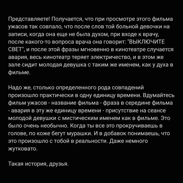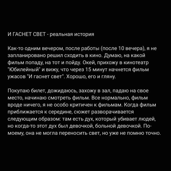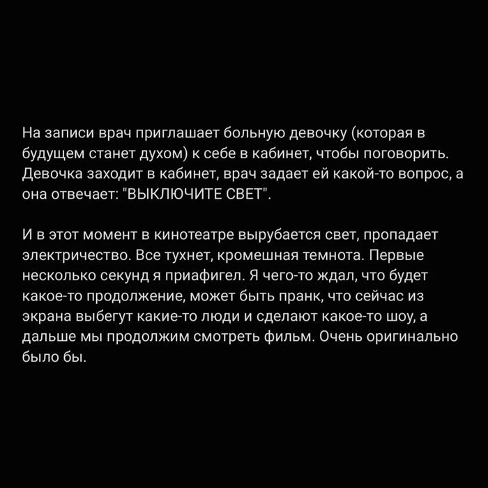Секунд через 20 электричество дали, было бурное обсуждение произошедшего и просьбы больше нахуй так не делать. Остаток фильма мы досмотрели скучая, т.к. все самое интересное уже произошло.
