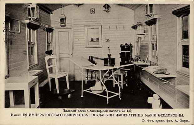 Во время русско-турецкой войны появились военно – санитарные поезда, которые впервые применили в 1877 году. Применялись такие поезда и во время войны с Японией. Строились они не только за госсчёт, но и на пожертвования меценатов. По положению от 1912 года все санитарные поезда разделялись на полевые и тыловые. Полевые предназначались для эвакуации раненых и больных в отдаленные от фронта районы, а тыловые были лучше оборудованы, имели отделение для тяжелораненых и операционное, главной функцией являлась транспортировка на дальние расстояния. Из воспоминаний артиста Александра Вертинского: «Госпитали Москвы были забиты ранеными. Госпитали эти были не только казённые. Многие богатые люди широко откликались на патриотические призывы земства и открывали на свои средства больницы для раненых.