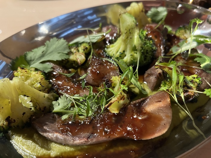 Вторая тёплая закуска – язычки ягнёнка с брокколи и кремом из баклажан (1790₽). Так и просится в рот.