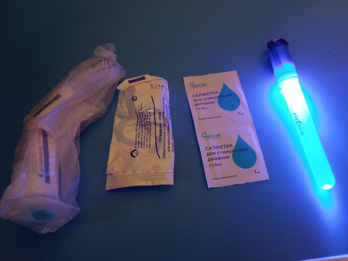 Слева направо: воздуховод Гведела (чтобы не запрокинулся язык, я знаю, что нужны разные размеры, всё снимать не стал), маска для искуственной вентиляции лёгких (с клапаном), салфетка с нашатырным спиртом (я знаю, что аммиак может быть опасен, заменил буфус), светящаяса палочка (вместо фонарика, заменил ХИС).