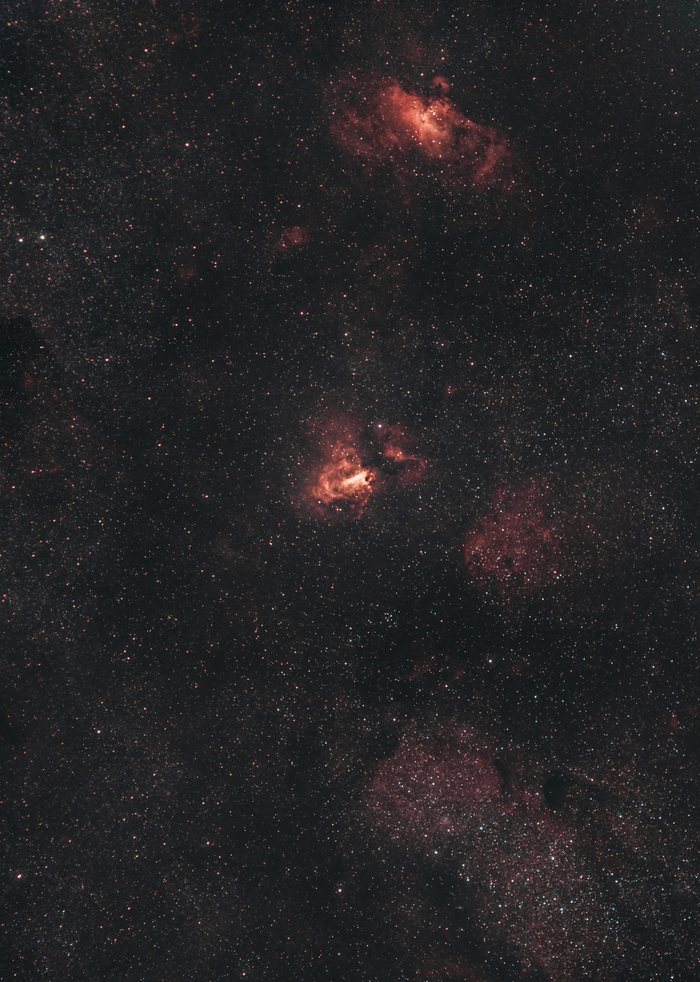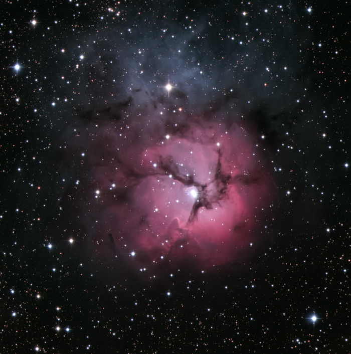 Красивая Тройная туманность — это особая область космического пространства в контрастах. Она находится на расстоянии порядка 5 тысяч световых лет от Земли Стрельца. Это зона формирования звезд в плоскости нашей галактики. Тройная туманность иллюстрирует три разных типа астрономических туманностей; красный цвет на фото — это признак эмиссионной туманности, в которой преобладает свет от атомов водорода, голубой — отражающей туманности, создаваемой пылью, отражающей звездный свет, и темный — туманности, где в силуэте появляются плотные пылевые облака. Однако область красных эмиссий, грубо разделена на три части, заслоняя пылевые полосы, является тем, что когда-то способствовало Тройной туманности в получении своего имени.