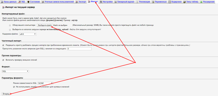 Если SSH доступа к хостингу сайта нет, то сделаем тоже самое через web интерфейс базы, например phpmyadmin и скачаем контент через ftp.