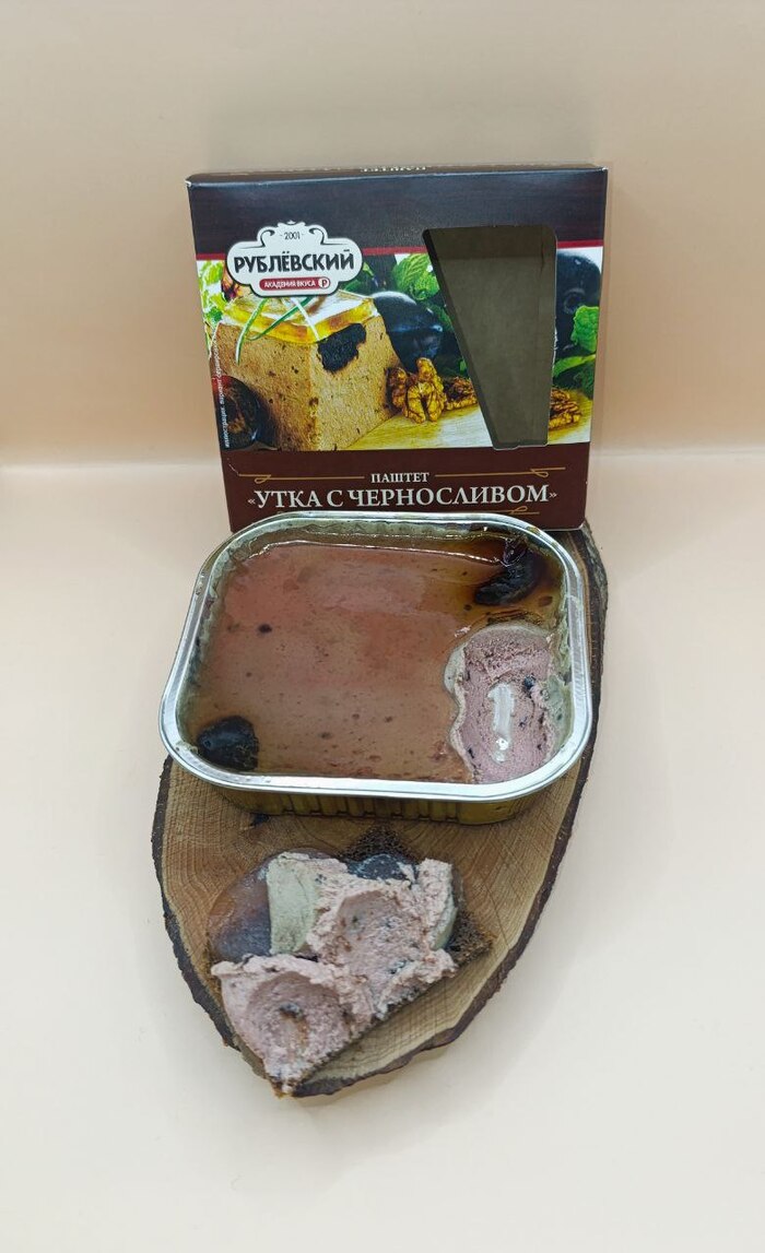 Повелась я на "богатую" коробочку, утка, чернослив, да еще и рублёвский... Но всё это оказалось пылью в глаза, паштет жирный, как будто переборщили с маслом, поэтому консистенция не нежная, а масляная, чернослив не чувствуется совсем, желатиновый слой сверху лишь украшение, никаких вкусовых функций он не несёт. Это обычный, весьма средний паштет, визуальный "вау-эффект" не отображается во вкусе.