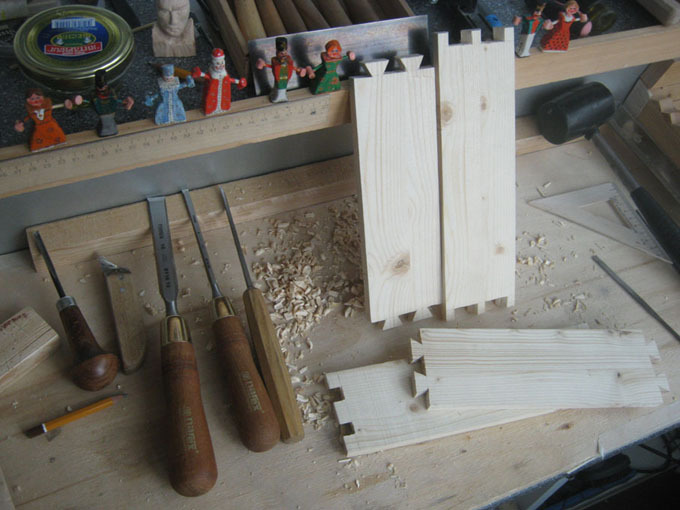 Из-за микроскопических неточностей в пилении неожиданно получились отличные соединения — тавровое и с заплечиком, сборка превосходно держалась и без клея.