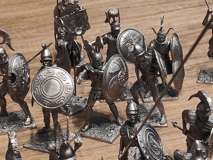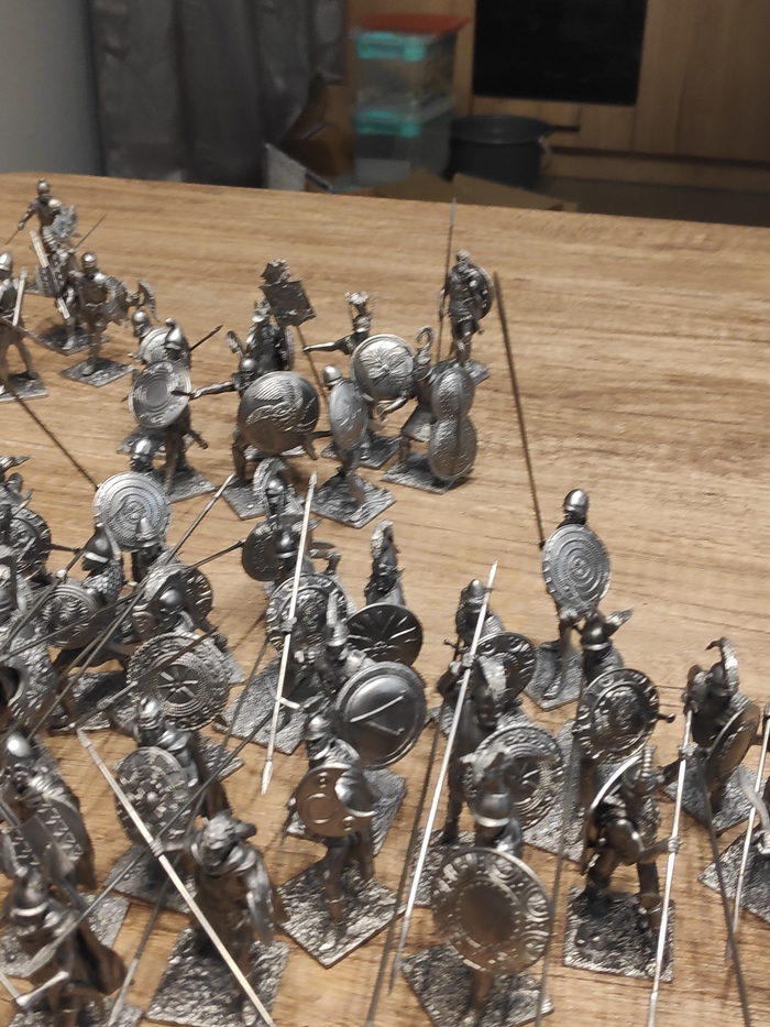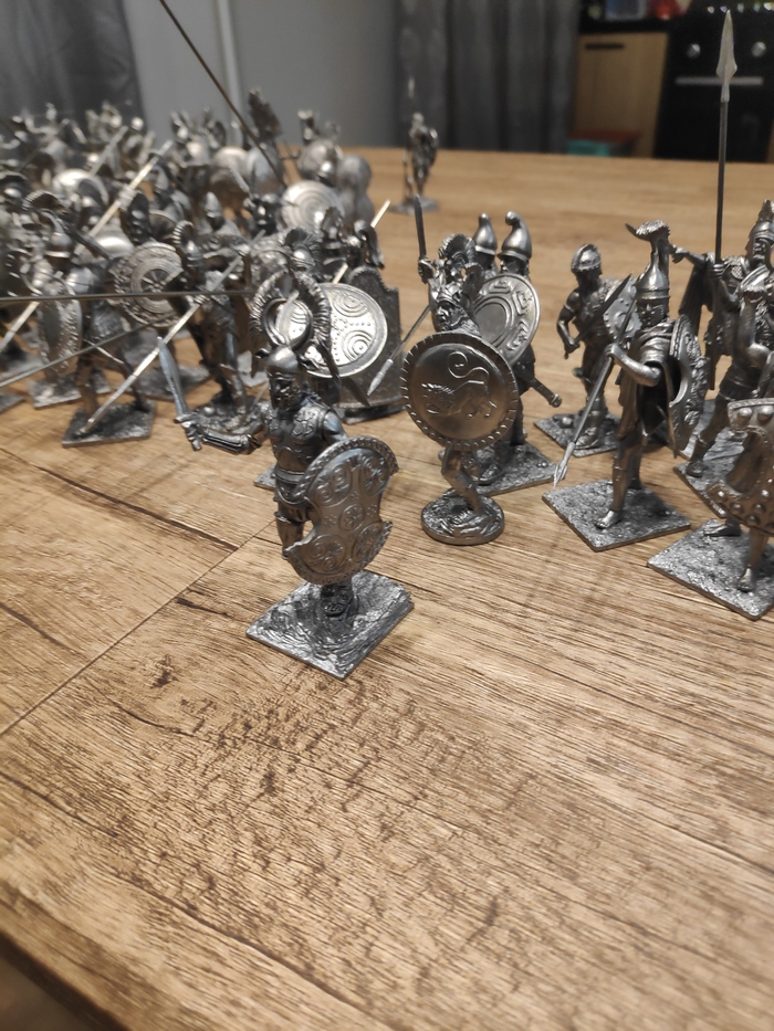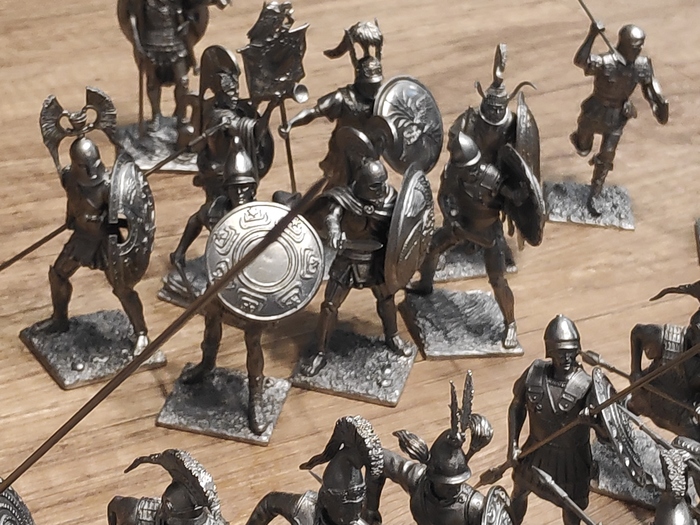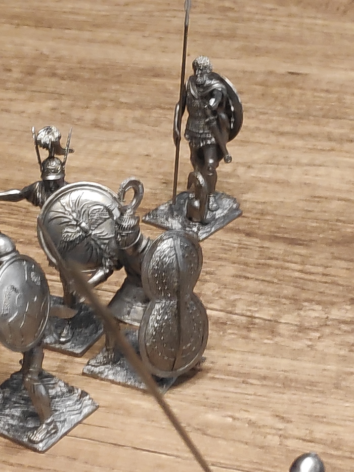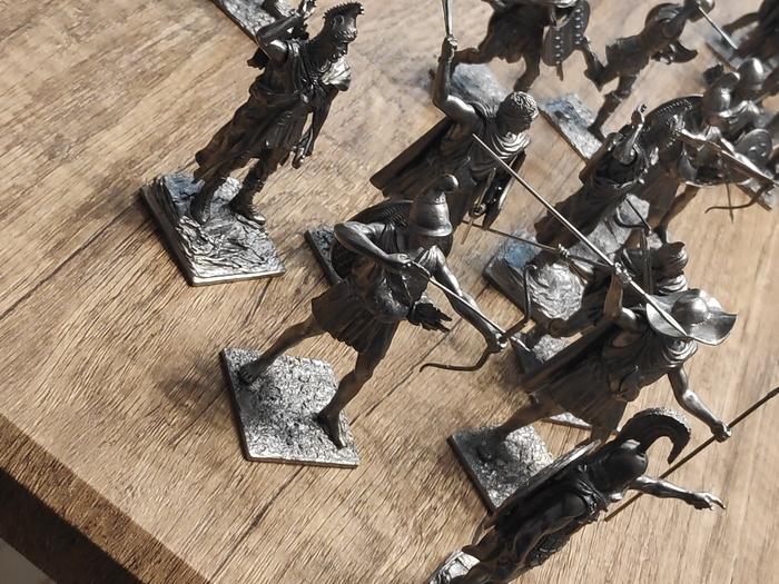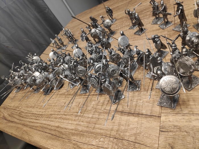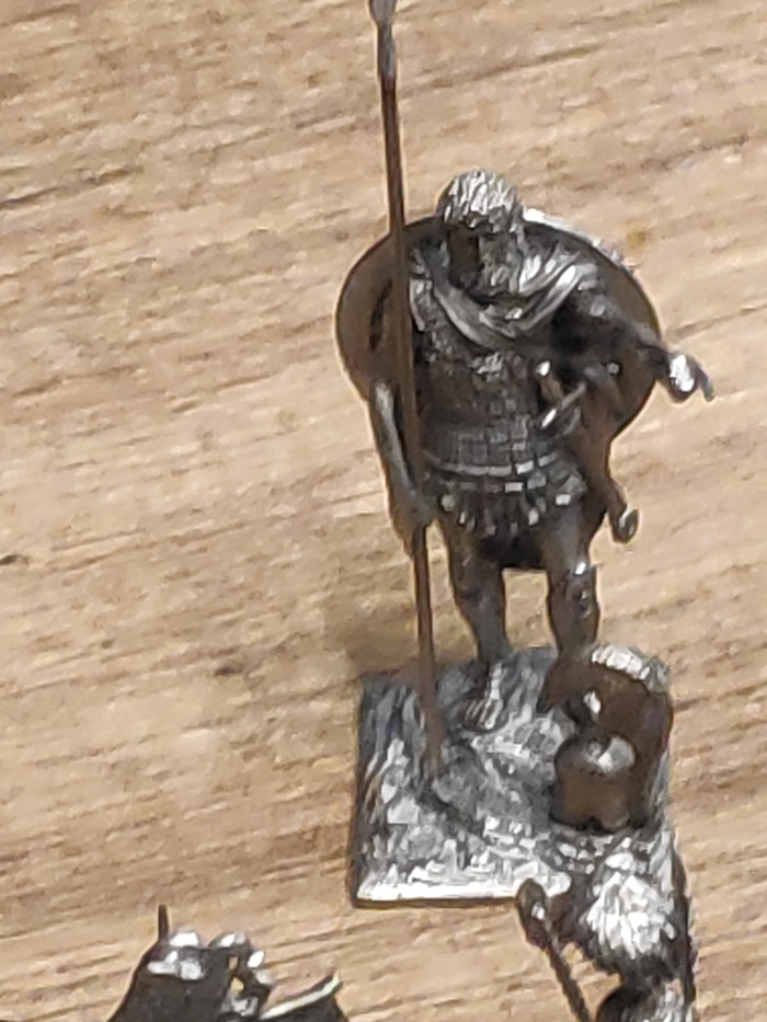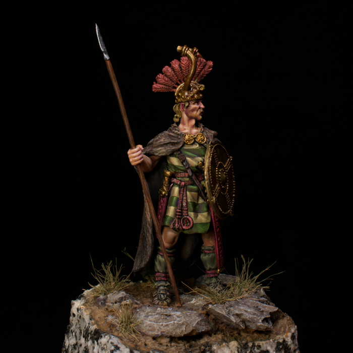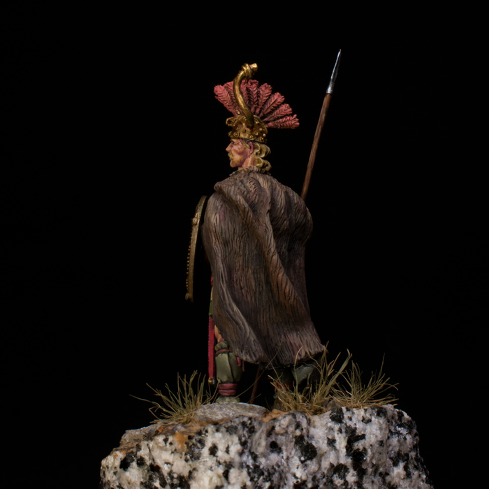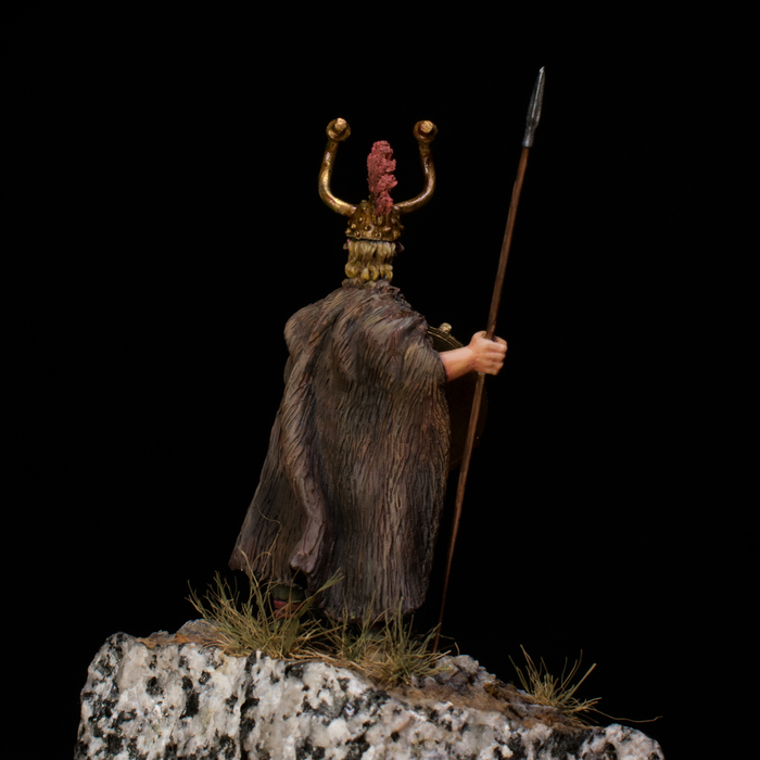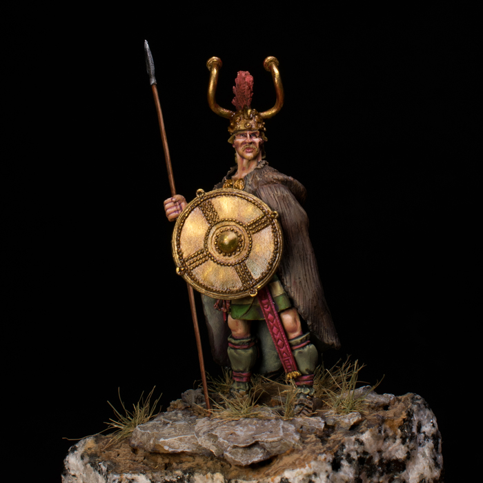 Вождь одного из племен, проживавших на территории современной Дании в церемониальном облачении (несколько таких шлемов было найдено в Дании, причем в неплохом состоянии). О языковой принадлежности этих народов мы не узнаем никогда, поскольку они были уничтожены, в том числе знаменитым Гаем Марием. Масштаб - чёткие 54 мм, металл. Фигурка фирмы Leonhard Miniatures. Роспись акрилом и маслом. В качестве подставки использован не самый распространённый в наших кругах материал - приличный кусок серого облицовочного гранита. В этом есть свои плюсы: как-то в очередной "схватке" "металлистов" и "смолянистов" прозвучало, что когда фигурка тяжелее основания, то за неё постоянно трясёшься при покраске, чтобы ненароком не опрокинулась, потому что чинить металл посложнее, чем смолу. Ну в данном случае полный порядок - основание в разы тяжелее самой миньки. При сборке оказалось, что между тушкой и куском плаща образуется зазор более 3 мм. Вот тут жидкую "зелёнку" от Цитадели я оценил по достоинству! Помучиться, конечно, всё равно пришлось, но в итоге она справилась на все 100%!