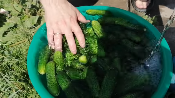 Первым делом, огурцы нужно замочить часа на 3-4 в обычной воде. Так огурчики зимой не будут пустыми и останутся хрустящими. После этого хорошо моем, в этом году у нас (да и не только) стоит страшная жара и пришлось ехать на колонку в деревню, потому что у нас воды днем нет вообще.