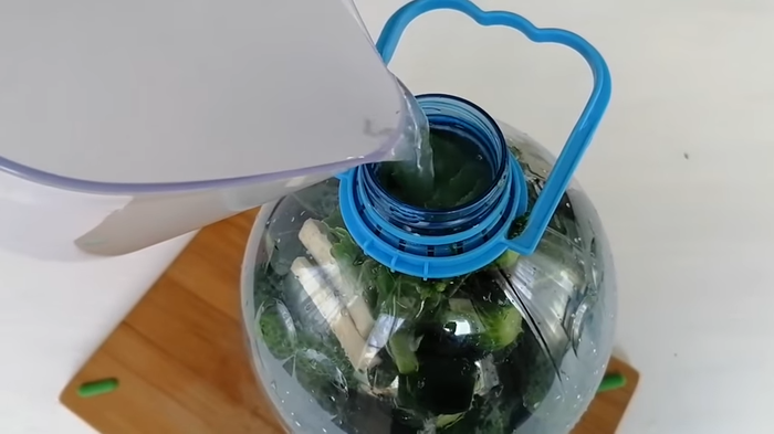 Заливаем огурцы в бутылке приготовленным рассолом. Использую бутилированную холодную воду (отлично подойдет колодезная), на 1 литр воды растворяю 2 столовые ложки соли. Несколько лет назад засекали время и всего за пять минут залили соленой водой 100 кг подготовленных огурцов! Получилось больше 20 бутылей.