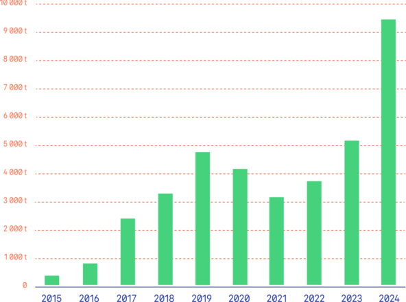 Для сравнения в 2022году 5005 тонн, переработано 84%, 4% были восстановлены 12%, утилизированы.