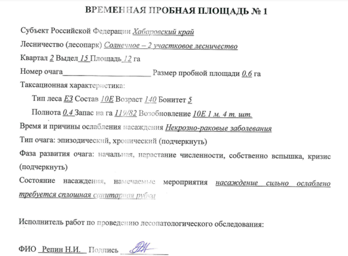 Корреспондент DVhab.ru cвязался с сотрудником авиабазы Николаем Репиным, который в документах значится как исполнитель лесопатологического обследования. Он сообщил, что его квалификация позволяет проводить подобные исследования – он является инженером по лесопользованию, а также обучался на профильных курсах.— После того как я составляю акт о состоянии леса, его проверяют не один раз, в том числе может и прокуратура проверить, он есть в свободном доступе на сайте управления лесами. Если там что-то не совпадает с моими выводами, дальше его никто бы не пропустил. А раз пропустили - значит в этом лесу действительно все плохо. Я постоянно это место мониторю, еще три года назад лес там стоял зеленый, потом резко начал усыхать. Если его не рубить, он погибнет от пожаров вместе со здоровым – например, от сухой грозы, — рассказал Репин.