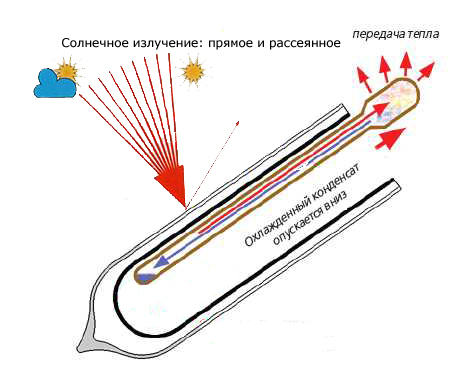 2) Вакуумные С.К представляют собой двухслойные трубки в межслойном пространстве которых вакуум, что позволяет уменьшить тепло потери. Внешний слой трубки прозрачный, а внутренний нанесено улавливающий световое излучение покрытие. Подобный тип С.К способен нагреть теплоноситель до 300 °C.