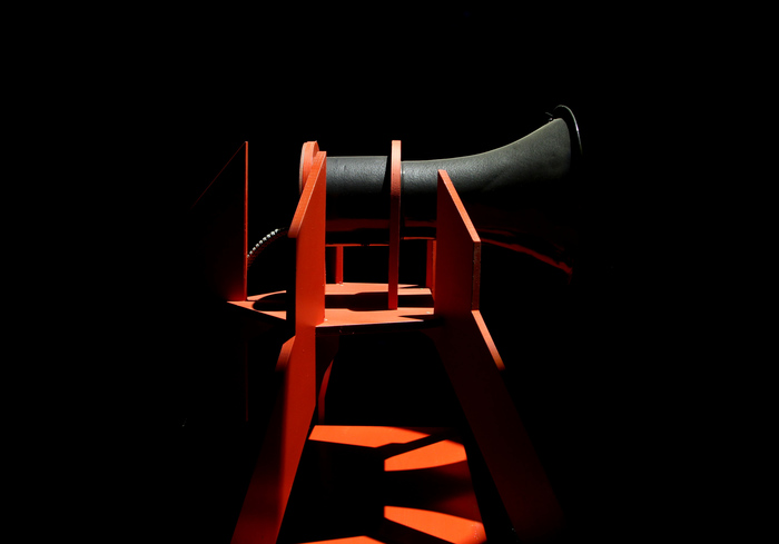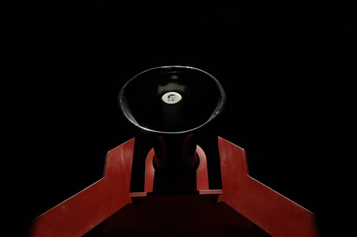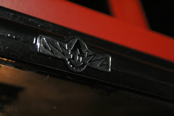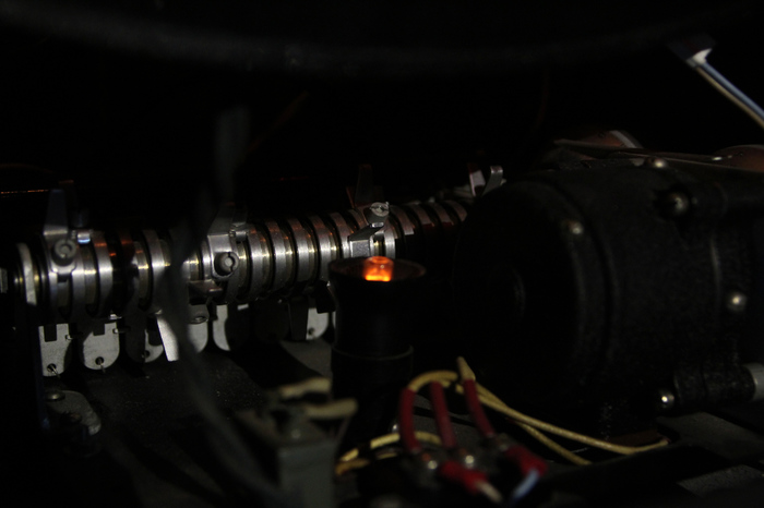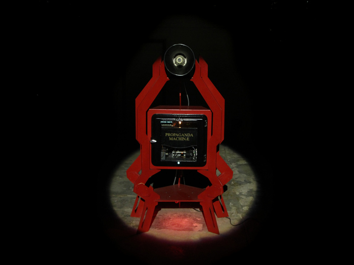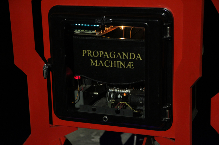 В качестве основного канала пропаганды я использовал рупор электромегафона. Само сердце машины построено в корпусе от старого автоматического моста-самописца. Он был изрядно поврежден коррозией, но плавные обводы и дизайн мне понравились, и захотелось применить именно его. Посмотрите на шильду завода - она просто потрясающая, латунь, штамповка+хромирование. Логотип завода опознать не удалось, подскажите в комментариях если узнали. Сам мост 60го года выпуска.