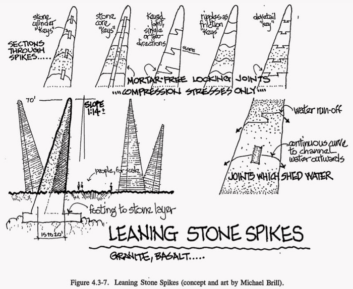 Далее, возле насыпей предполагается возведение гигантского гранитного монолита, который исполняет желания имеет вогнутую форму. Так внутренняя поверхность защищена от осадков, монолит сложнее использовать в строительстве… а ещё так он “кажется менее почётным, нежели вертикальная стела”. На монолит наносится информация II и III уровня. Текст должен быть расположен достаточно высоко, чтобы его не занесло наслоениями земли и было непросто намеренно стереть. Вокруг главного “материнского” монолита может быть несколько монументов поменьше, одновременно очерчивающих площадь опасной зоны. Одни высокие и узкие, чтобы дольше торчать из песка, другие низкие и мощные, чтобы их было сложно уничтожить. Были предложения сделать в монолитах отверстия, чтобы ветер, проходя через них, издавал свист и таким образом привлекал внимание...