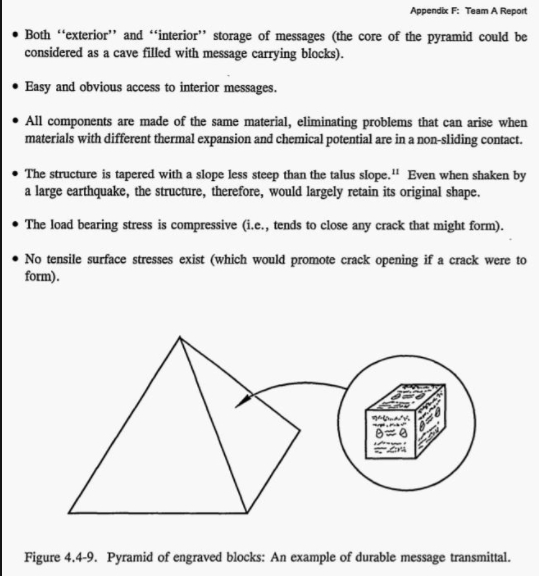 Кураторы проекта обратились к имеющимся наработкам на эту тему. Оказалось, что пока в США индейцы бодались с геологами за многострадальную гору, один из участвующих в приготовлениях институтов занялся исследованием вопроса. Планируя своё хранилище на дилетантские 1000-10 000 лет вперёд, специалисты из Sandia National Laboratories всё же задумались, что будет если за это время случится [ДАННЫЕ УДАЛЕНЫ] и репозиторию потребуется самостоятельно убеждать посетителей держаться подальше. Командой инженеров и антропологов было разработано т. н. гештальт-сообщение: система маркеров, которая всей своей сущностью сообщает об опасности, и которая должна остаться распознаваемой очень долго.