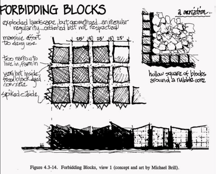 Заградительные Блоки — лабиринт массивных бетонных блоков, стоящих плотно друг к другу. Между ними тесно и горячо, их ликвидация трудозатратна — гарантия, что никто не будет селиться здесь. Как более дешёвый вариант предложена ограда из таких блоков, окружающая гору строительного мусора.