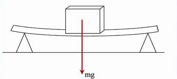 Хотите ещё? Возьмём достаточно длинную деревянную рейку квадратного сечения и уложим её краями на два табурета – так, чтобы получился «мостик». В центре этого мостика уложим груз – тяжёлый, но не настолько, чтобы нашу рейку сломать. Под действием груза рейка прогнётся дугой: