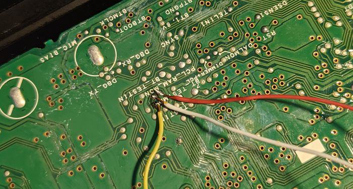На самой плате удобнее припаяться к тестовым пятакам снизу. Какой провод за что отвечает на фото уже не вспомню. Да и если вы надумали повторить это и не знаете как прозвонить контакт - то вам явно не стоит лезть в это.