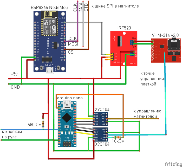 Если кому нужен только адаптер кнопок руля - просто берем нижнюю половину схемы и убираем нижний цифровой резистор X9C104 и резюк на10 кОм (так же убираем его если платка без кнопок или вообще другой модели).
