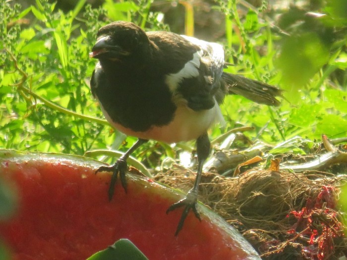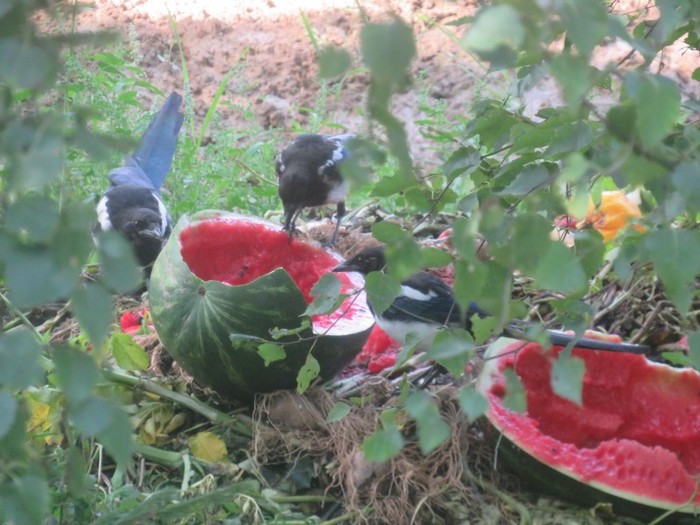 Даже с вороной временное перемирие на почве алкоголизма - так-то сороки у нас тут ворон гоняют, ведя сложные позиционные сражения, но под арбуз прежние разногласия временно забываются.