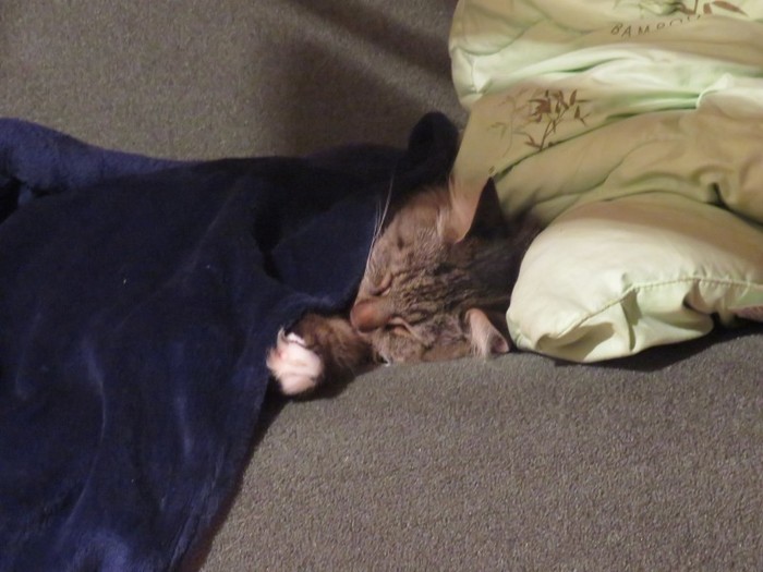 Кошка лежит дома, она так не договаривалась, она категорически против того, чтобы на нее с деревьев прыгали с воплем "Банзай!", она лучше пока на диванчике перекантуется.