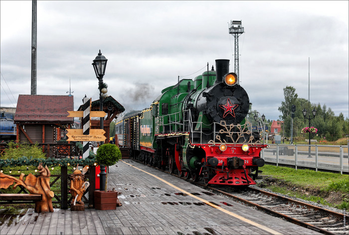 Путь проходит через ж\д пути, где проезжает ретро-поезд: