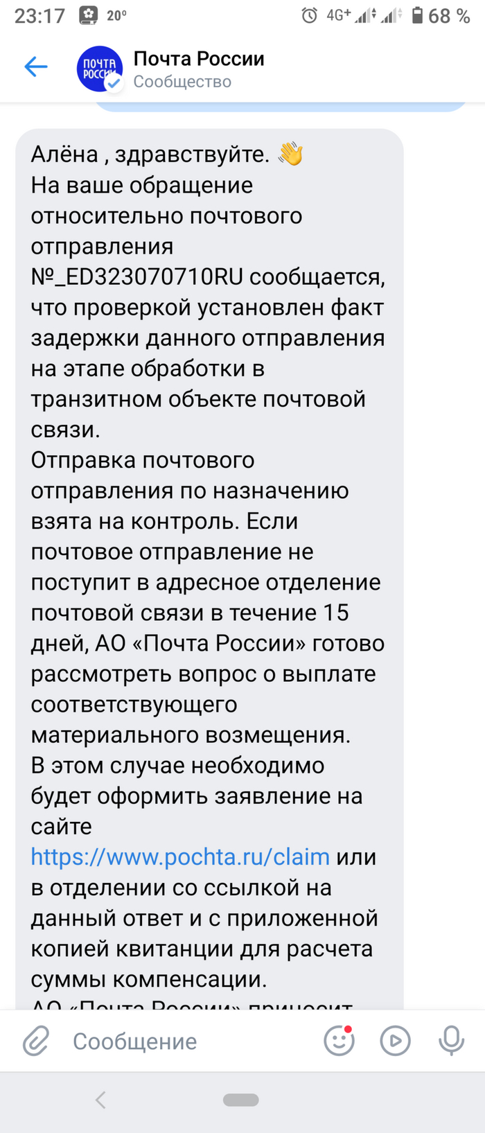 / Не знаю как технически устроена почта, но это единственная активная посылка на моем аккаунте. Если у почты есть возможность проверить посылки по аккаунту, то Наталия просто забила мне помогать.