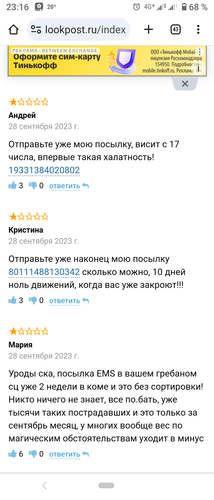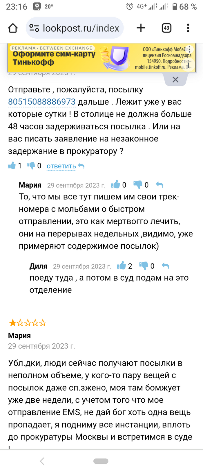 С этого момента посылка ВСТАЛА НА ПРИКОЛ. Через 2 дня я озадачился и ради интереса полез в отзывы на яндекс картах и гугл картах, почитать - что же так сильно задержало мою посылочку, вопреки всем ГОСТам и внутренним правилам самой почты России?