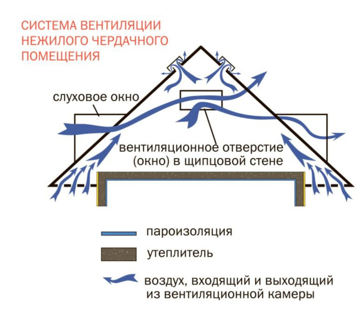 Холодный чердак должен соответствовать своему названию и быть действительно холодным – неутепленным и вентилируемым. А также отсутствие вентилируемой воздушной прослойки в скатах крыши под кровельным слоем в конструкции утепленной кровли (при отапливаемом мансардном этаже).