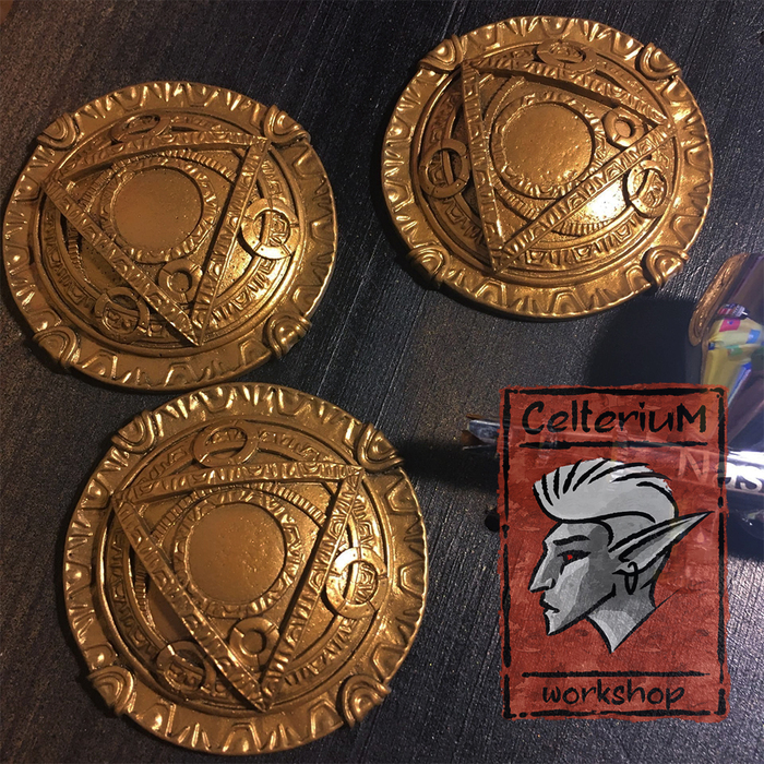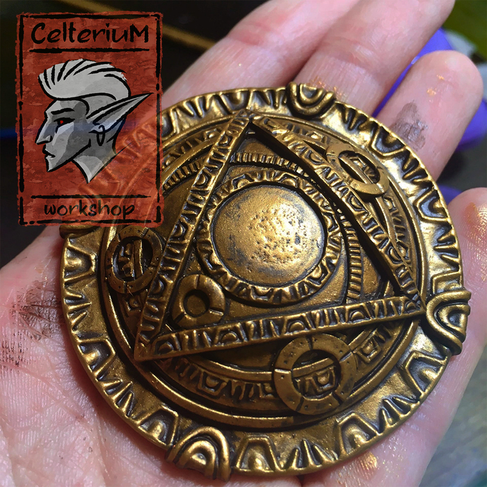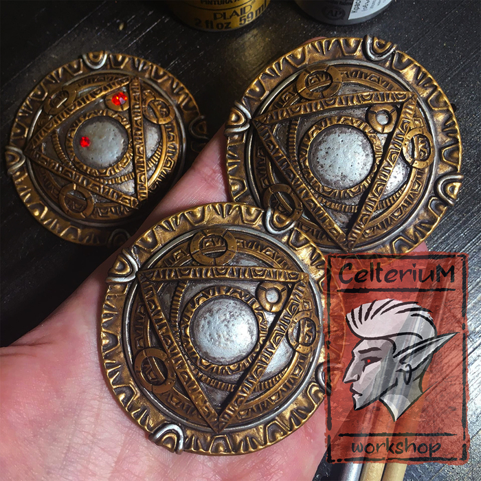 По задумке амулет должен был быть чисто "латунным", но по факту все визуально слилось в единую кашу, так что пришлось импровизировать уже в процессе, перекрасив несколько элементов под сталь.