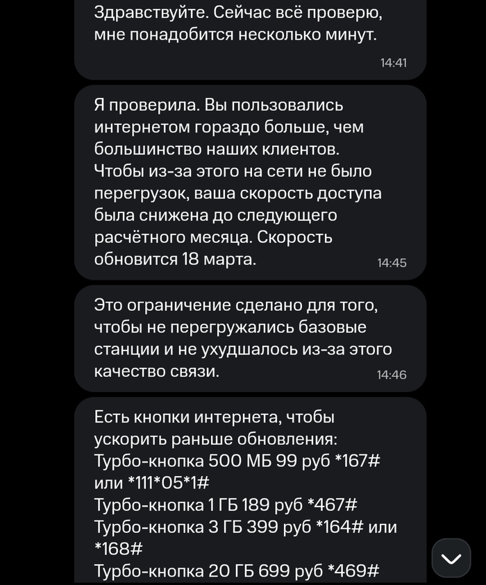 Пишу в поддержку, без грубости, но с указанием на явный косяк, прошу не епать мне мозг, а провести платеж нормально. Такой-то там Санек, естественно начинает писать пургу, кидаю ему скриншоты времени платежа из приложения банка, скрин с детализации где видно что платеж пришел, а ровно за 1 секунду до этого якобы было СМС. И самое главное - кидаю ему скрин, что у меня на тарифе заблокированны СМС в принципе, я их если даже захочу отправить - не получится. Чувак удалается на анализ полученной инфы.