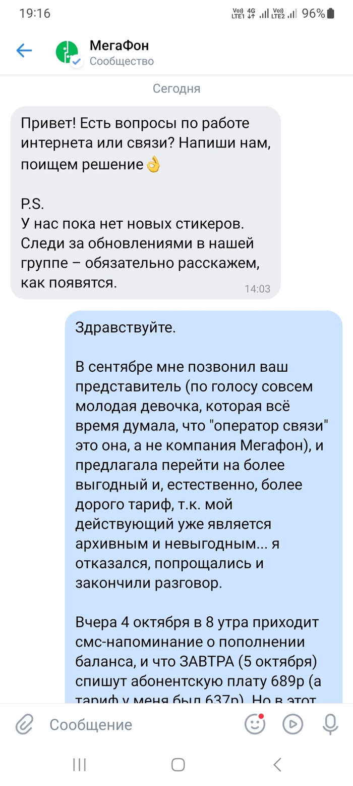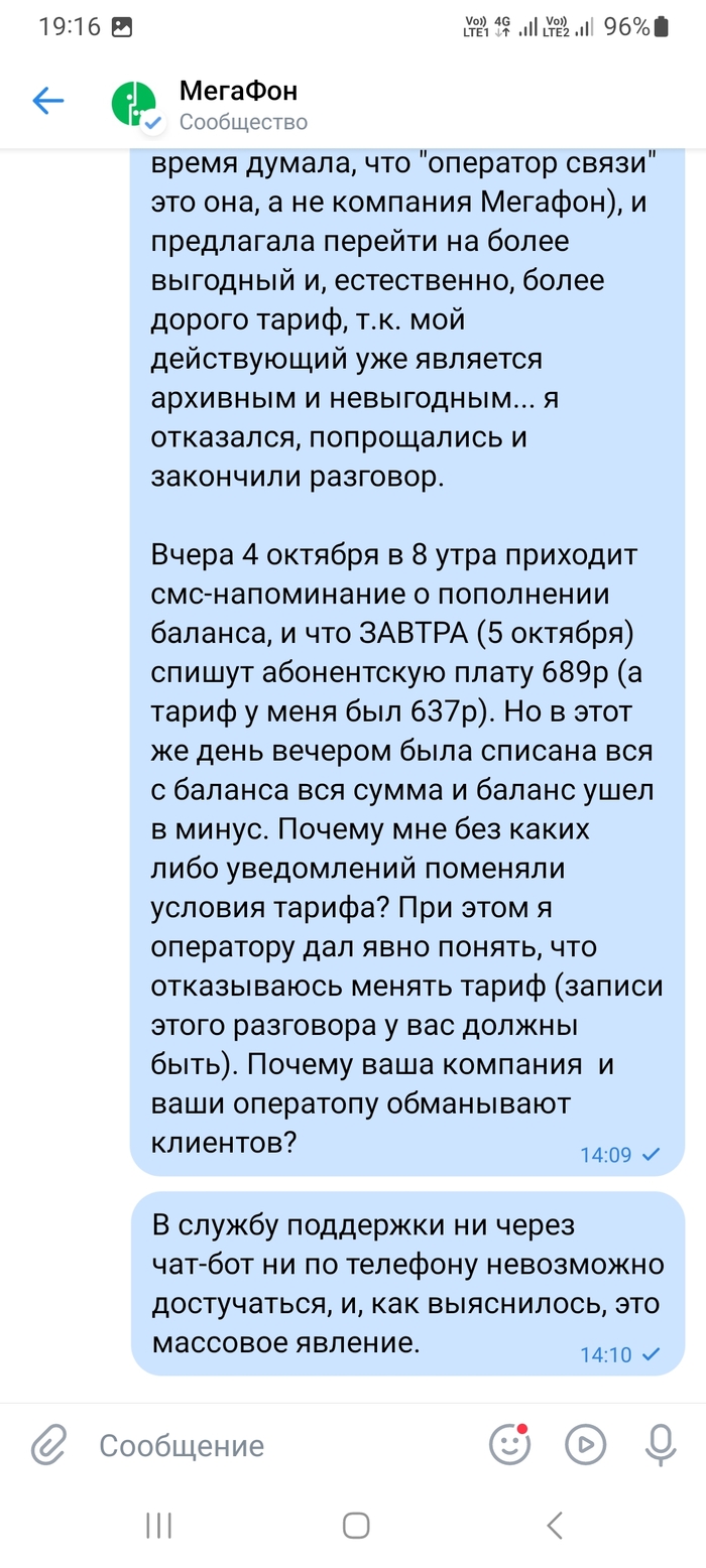 На следующий день, 25 сентября, снова утро, снова интернет "отвалился", снова обещанные сервисы не работают. Я опять пишу в поддержку. После бесполезных советов Смарти ("включите авиарежим", "перезагрузите телефон" – серьезно?!), подключается оператор Дарья. Я снова объясняю ситуацию, указываю адрес, но подчеркиваю: "Но эта ситуация по всему городу. [...] Так не только у меня. У всех. У всех моих родственников, у всех коллег. Я просто не пойму озвученные данные в СМИ это ошибка, или эта всеобъемлющая проблема у всех абонентов МТС в Краснодаре?"