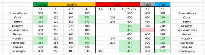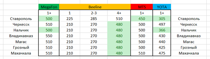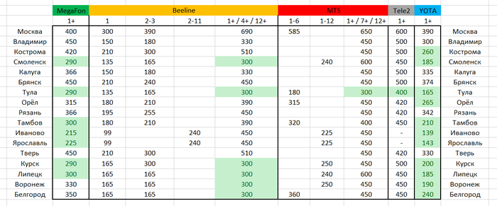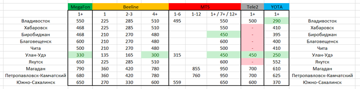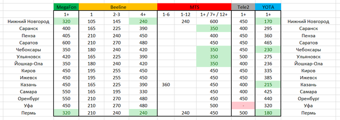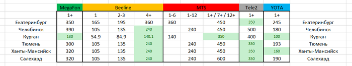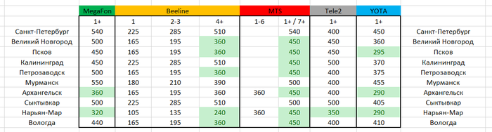 Ну что ж, товарищи, с прошлого обзора много времени утекло и тарифы успели поменяться. Строка с 1,2-3,4+ означает месяцы: 1- первый месяц, 2-3 второй и третий месяцы, а 4+ - четвертый и последующие месяцы. Ростелеком не рассматриваем, так как он отказался от безлимитных тарифов для смартфона. Yota рассматривается в варианте безлимитный интернет + 0 минут.