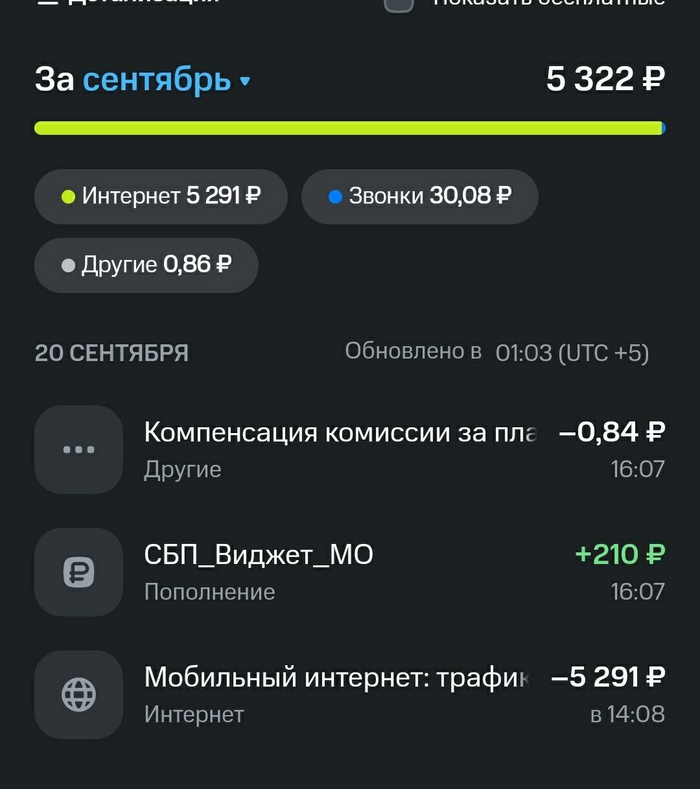 Еще хотел бы отметить интересный нюанс: оплата за тариф в приложении отображается по актуальному времени, а списание за трафик — по московскому, из-за чего оно переместилось вниз по хронологии.