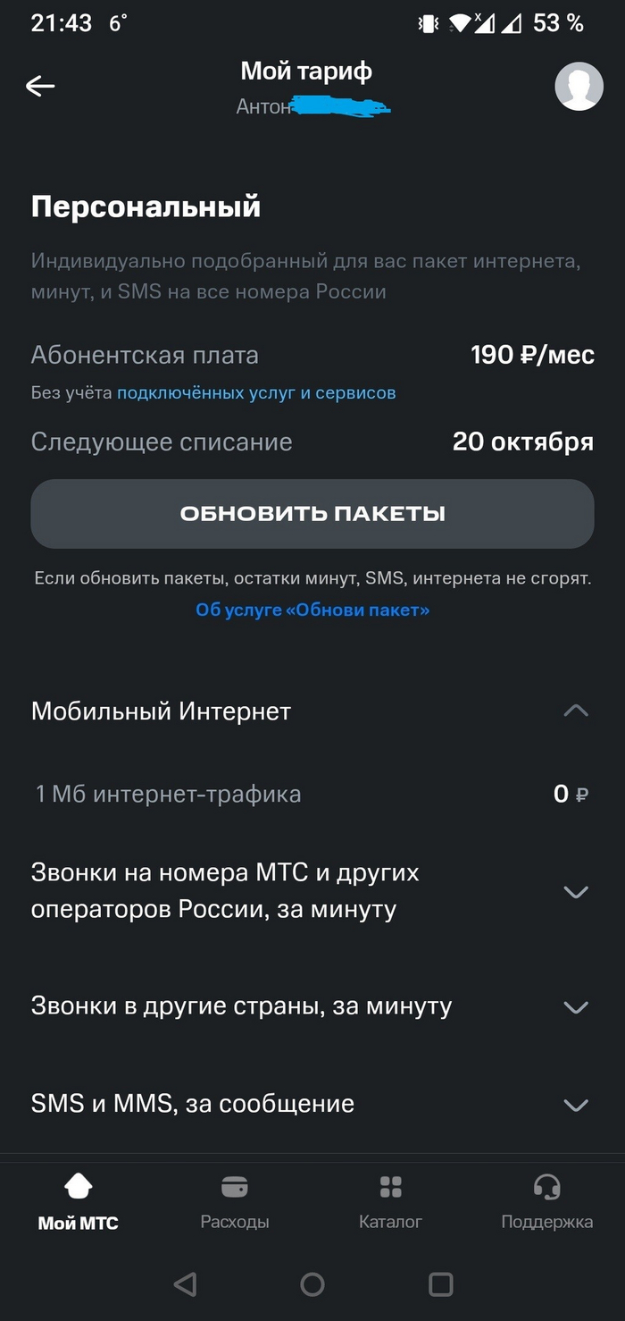 В приложении я увидел, что тариф действительно активировался (причем без оплаты с моей стороны), а все пакеты (трафик/минуты/смс) были доступны.