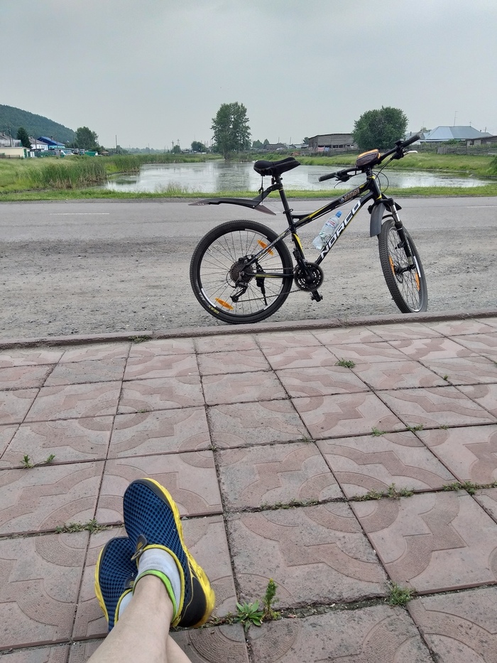 И вот когда до цели оставалось 15км, я почувствовал усталость, но не сдавался. Периодически останавливался попить водички и снова в путь. Руки затекали, даже с новыми широкими грипсами с рогами, хватов для расслабления не хватало. Жопа тоже молила о кресле, седло уже казалось неудобным(стоковое), хотя поначалу мне понравилось. Когда привставал на седле - это была боль. Постоянно и особенно на подъёмах было желание задавить жабу и купить заднее редукторное мотор-колесо ватт на 750 для таких моментов. Наконец появились знакомые названия населённых пунктов и вот осталось всего 5км. Но снова подъём, который был затащен на волевых качествах без остановок. И наконец та самая деревня! Урааа! Ровно 60км, время - 14:30. Мои были сильно удивлены тем, что приехал не на автобусе.