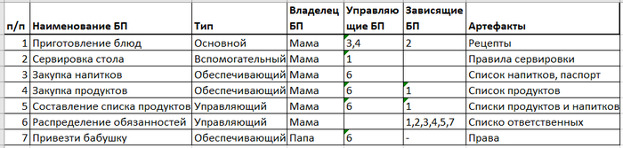 Пишем табличку в экселе или конфлюенсе: п/п, Наименование БП, Тип, Владелец БП, Управляющие БП, Зависимые БП, Артефакты (инструкции, регламенты).