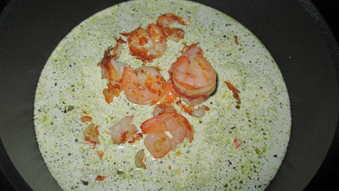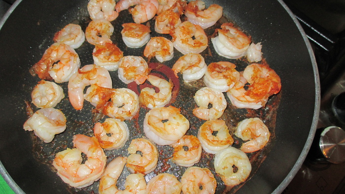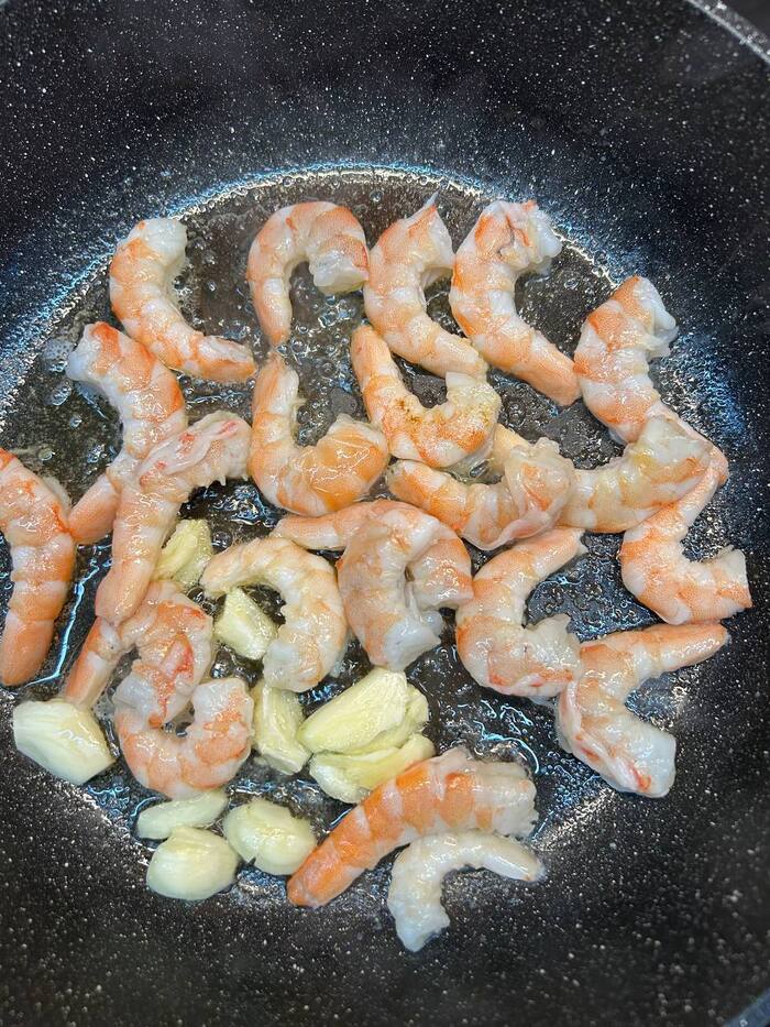 Шаг 2. Креветки на жарку! Разогрела оливковое масло, закинула чеснок и, пока он не сгорел, добавила креветки. На кухне запахло чем-то ресторанным, и я уже почувствовала себя почти шеф-поваром. Правда, одна креветка всё-таки умудрилась сбежать за плиту... Но у меня всё под контролем, не переживайте!