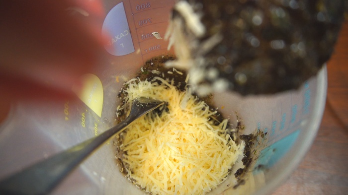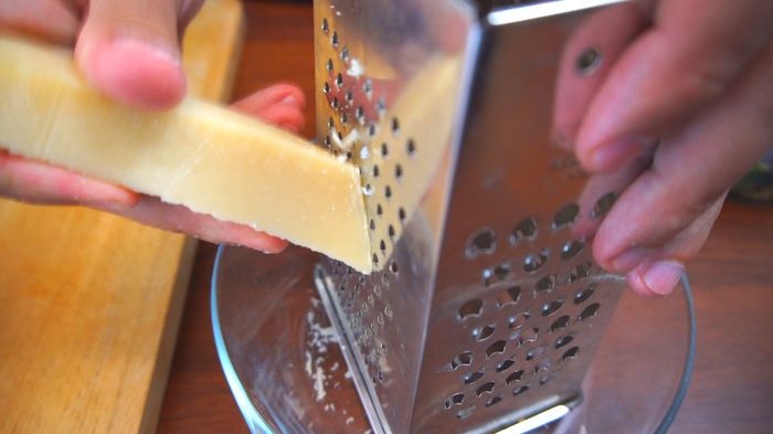 1. 50 гр. пармезана. Пармы у нас под боком нет, зато есть братская Белорусь. Нашла в холодильнике кусок засохшего сулугуни. Пойдёт. Тру на терке.