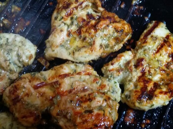 Смешайте сливочное масло и остальные ингредиенты, нагрейте на среднем огне, смешивая, пока не образуется негустая паста. Обязательно держать в тепле. Затем горячем соусом обильно смажьте курицу. Поджарьте срезы булочек на гриле.